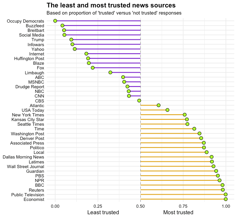The Reynolds Journalism Institute (RJI) at the University of Missouri did a poll of trusted news sources in the US earlier in 2017. The results of the poll are fascinating, although it was limited to US media sources (except for The Guardian, The BBC, and The Economist–although it is instructive to note that the three British publications were highly regarded as trustworthy). Facebook is apparently trying to gauge trustworthiness and it will be interesting to see the results of that experiment.