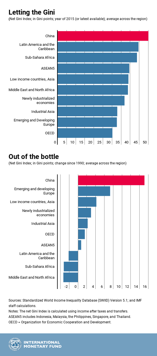 Chinese success in reducing absolute poverty is stunning: between 1981 and 2004, the number of people living in poverty shrank by 600 million. The reduction came as a result of remarkable policy reforms in the country which moved it away from an economy that was almost completely controlled by the central government toward one that allowed private ownership of property and reliance on market forces to determine wages and prices. But even while absolute poverty was being reduced, relative poverty was increased. We measure income inequality by a measure called the Gini coefficient where a value of zero means that everyone receives the same income and a value of 1 means that only one person has all the income in a society. By looking at the Gini coefficient, income inequality in China has gotten worse even as the economy has grown substantially.
