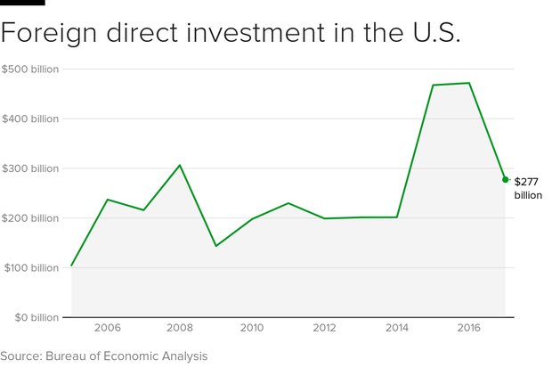 ” Foreign direct investment in the United States in 2017 was the fourth-strongest for the past decade, but was down 40 percent from 2016. This followed record-breaking years in 2015 and 2016; FDIUS for each year reached nearly half a trillion dollars. These investments benefit the American economy as international firms build new factories across the United States, buoy their well established U.S. operations, fund American research and development activities, and employ more than 6.8 million Americans in well-paying jobs.