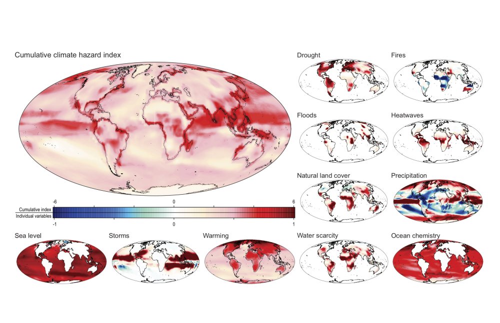 A new study from the University of Hawaii has reviewed thousands of peer-reviewed climate studies and analyzed the different ways climate change poses threats to humanity. The study came up with “467 ways in which human health, food, water, economy, infrastructure, and security have been impacted by multiple climatic changes including: warming, drought, heatwaves, wildfires, precipitation, floods, storms, sea level rise and changes in land cover and ocean chemistry.” Different regions of the world will experience different threats, but the study is the first to examine all possible impacts. The map below shows some of the impacts and how they will have differential effects.
