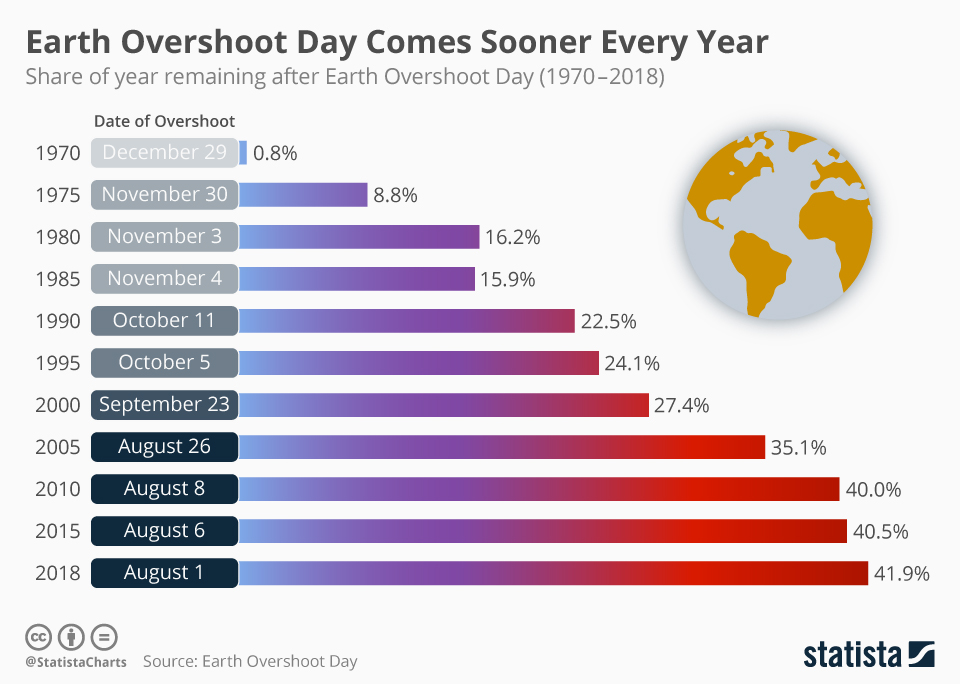 Tomorrow is Earth Day. One way to measure the human strain on the earth’s resources is to think about what is termed the overshoot day which is “calculated by comparing humanity’s total yearly consumption (Ecological Footprint) with Earth’s capacity to regenerate renewable natural resources in that year (biocapacity).” As the chart below suggests, every year we use up the earth’s resources at a much faster pace.