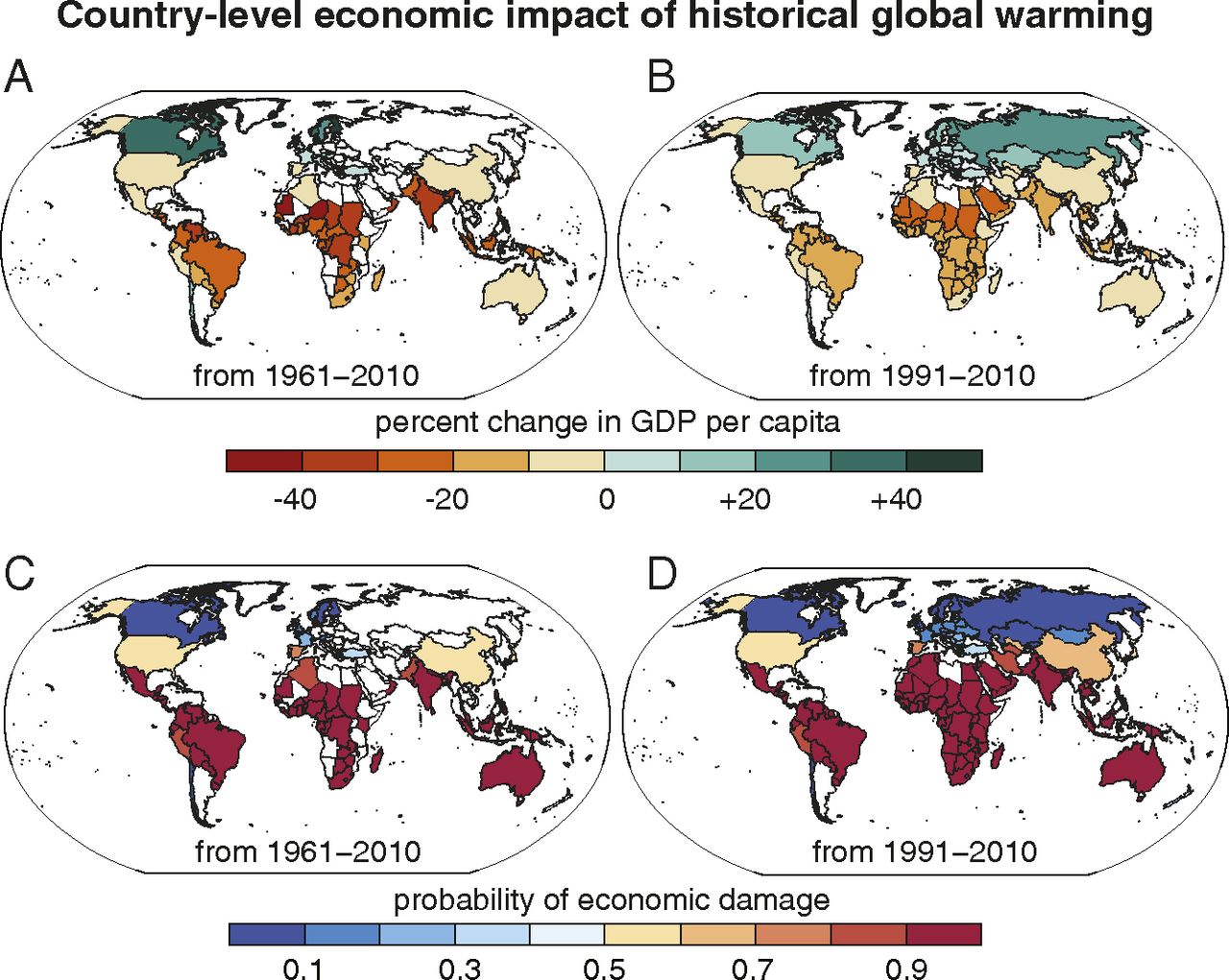 “We find that global warming has very likely exacerbated global economic inequality, including ∼25% increase in population-weighted between-country inequality over the past half century. This increase results from the impact of warming on annual economic growth, which over the course of decades has accumulated robust and substantial declines in economic output in hotter, poorer countries—and increases in many cooler, wealthier countries—relative to a world without anthropogenic warming. Thus, the global warming caused by fossil fuel use has likely exacerbated the economic inequality associated with historical disparities in energy consumption.”