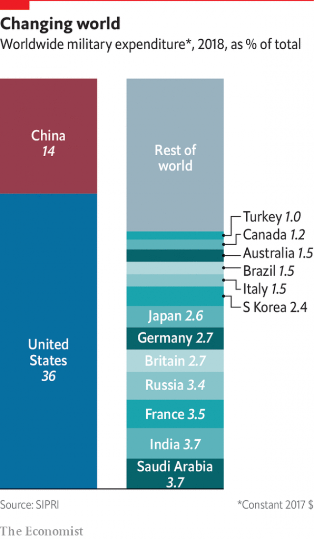 “The most interesting contraction is, however, in Russia. “Can they count?” President Vladimir Putin asked of his Western rivals in February. “I’m sure they can. Let them count the speed and the range of the weapons systems we are developing”. But despite the theatrical flaunting of new missiles, and NATO’s impressive rearmament to the west, SIPRI calculates that Russia’s defence budget actually shrank by 3.5% in 2018—putting it outside the top five for the first time in over a decade. This may be the result of a weakening rouble. But Russia’s long military spending spree seems to be drawing to a close. That is a sobering thought for Mr Putin.