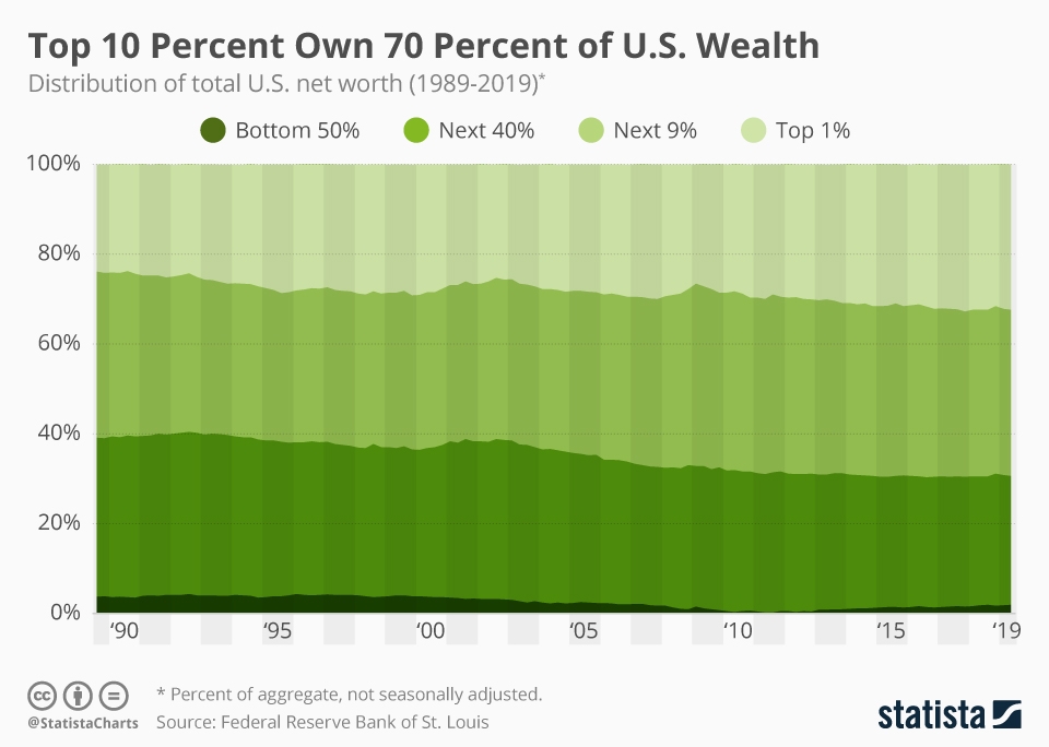 “10 percent of the richest people in the United States own almost 70 percent of the country’s total wealth. As of June 2019, the top 10 percent held 69.4 percent of total U.S. net worth (that is the value of all assets a person holds minus all their liabilities).