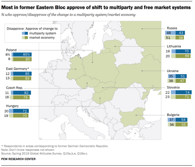“Thirty years ago, a wave of optimism swept across Europe as walls and regimes fell, and long-oppressed publics embraced open societies, open markets and a more united Europe. Three decades later, a new Pew Research Center survey finds that few people in the former Eastern Bloc regret the monumental changes of 1989-1991. Yet, neither are they entirely content with their current political or economic circumstances. Indeed, like their Western European counterparts, substantial shares of Central and Eastern European citizens worry about the future on issues like inequality and the functioning of their political systems.”