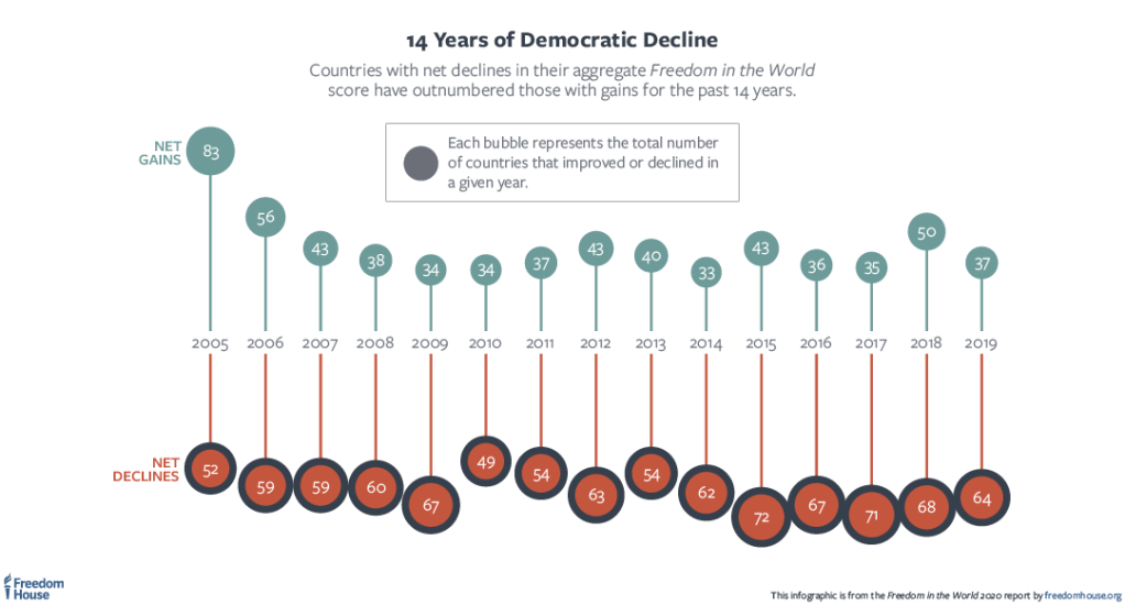 “Freedom House found that 2019 was the 14th consecutive year of decline in global freedom. The gap between setbacks and gains widened compared with 2018, as individuals in 64 countries experienced deterioration in their political rights and civil liberties while those in just 37 experienced improvements. The negative pattern affected all regime types, but the impact was most visible near the top and the bottom of the scale. More than half of the countries that were rated Free or Not Free in 2009 have suffered a net decline in the past decade.