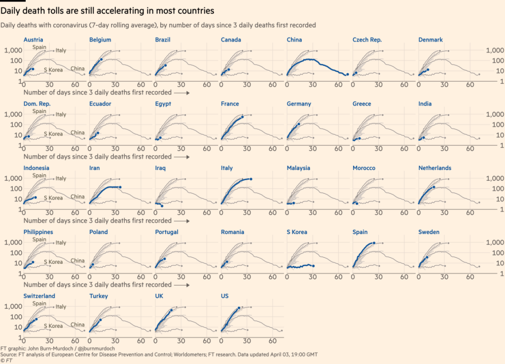 Ecuador is expecting as many as 3500 deaths in the city. The intensity of the situation in Ecuador is due to the large traffic between it and Spain, which itself has seen many deaths. The Financial Times has published graphs on the growth of coronavirus cases in various countries in the world.