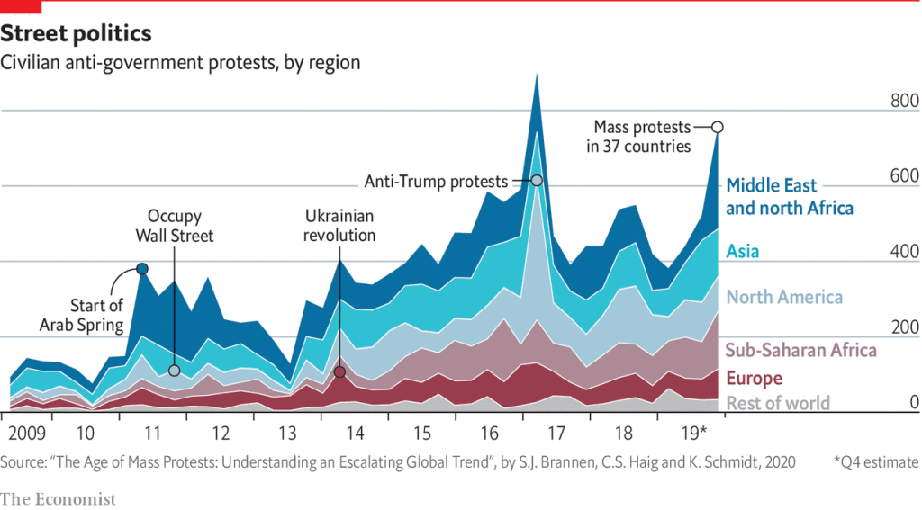 - The outbreak of the novel coronavirus in early 2020 appears to have temporarily interrupted the surge of protests from 2019 in Hong Kong and Iran, though protest movements from Canada to India continue.