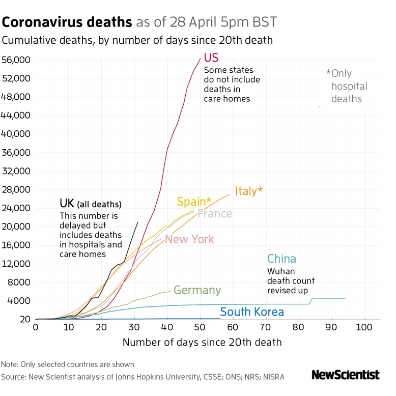 In a fit of petulance, the US has decided to stop contributing to the World Health Organization (WHO) for 60 days because it believes that WHO has been covering up China’s role in the COVID-19 pandemic. I will wait to see what evidence the Trump Administration has to validate its claims, but will at the same time acknowledge that WHO–like many international organizations–has to pay inordinate attention to state egos. But the decision to not participate in the development of a COVID-19 vaccine which WHO is trying to foster is the epitome of short-sightedness. Many of the scientists who work at WHO are among the best in the world, and the organization offers the opportunity to share information helping to avoid unnecessary duplication of efforts. The graph below from New Scientist is clear evidence that the US really should be asking for help from others–it is not doing a good job on its own.