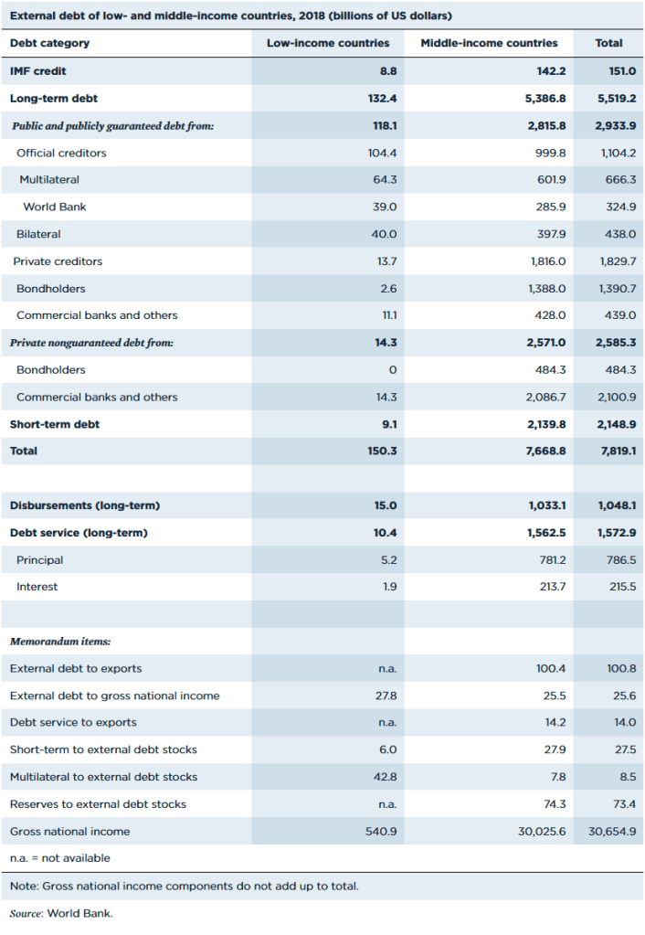 “Emerging markets and developing countries have about $11 trillion in external debt and about $3.9 trillion in debt service due in 2020. Of this, about $3.5 trillion is for principal repayments. Around $1 trillion is debt service due on medium- and long-term (MLT) debt, while the remainder is short-term debt, much of which is normal trade finance.