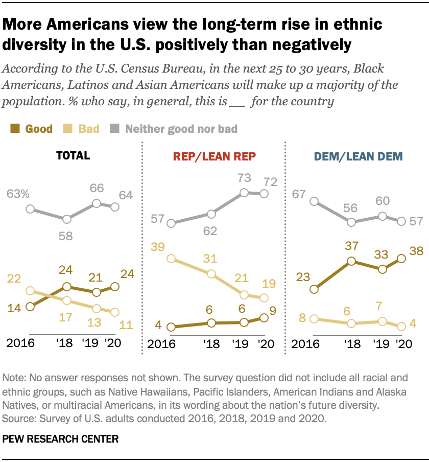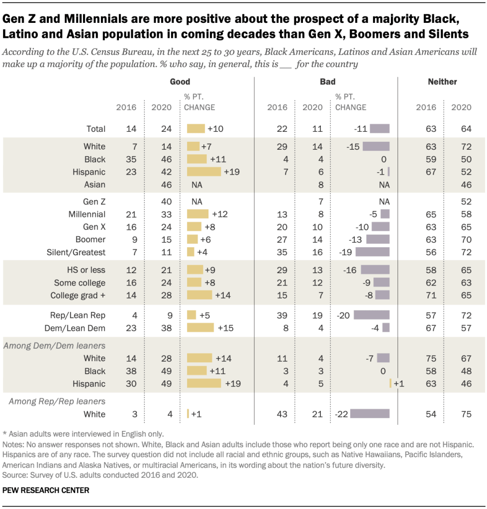 “While these views have changed little since 2018, the public expresses more positive – and less negative – views of the long-term rise in racial and ethnic diversity than it did four years ago, during the last presidential campaign. Since then, the share saying a majority Black, Hispanic and Asian population is a good thing has increased by 10 percentage points, while there has been a comparable decline (11 points) in the share saying it is bad thing.”