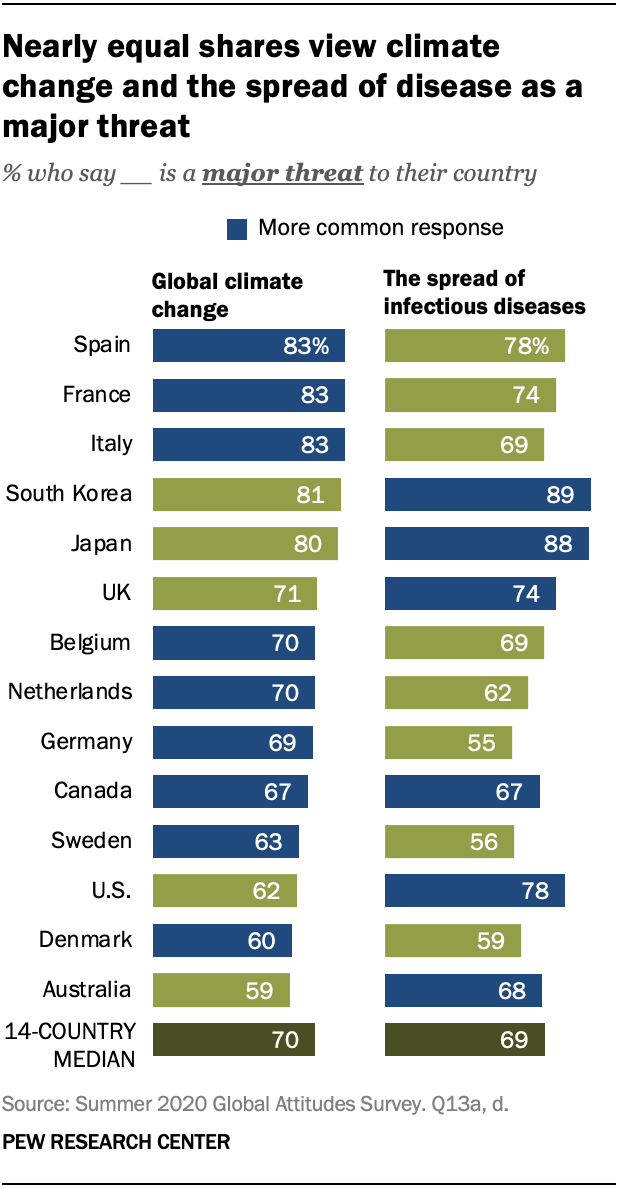 Unfortunately, climate change has not emerged as a major issue in the media coverage of the US national election even though former Vice-President Biden has tried to make it one. But it seems clear that even though it is not a major topic for the talking heads, the US public considers it almost as important as the problem of the COVID-19 pandemic. The Pew Research Center conducted a poll in several major countries and found that the issue is considered important in every one.