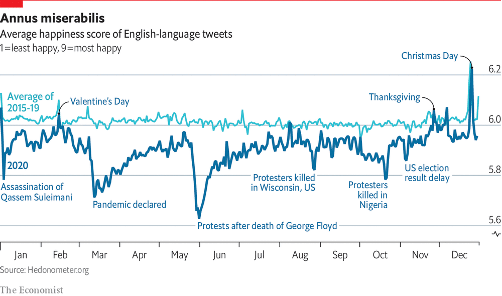 Over the last ten years, researchers at the University of Vermont have measured key words in all Twitter users using the English language. Their primary concern has been to measure words that reflect “happiness” (like “love”) and distress (like “suicide”). Their results for 2020 are represented in the graph below. Not surprisingly, 2020 has not been a “happy” year, yielding results below the average of 2015-1019. If one wishes to check against previous years, one should check the “hedonometer” (such a ghastly name) at the University of Vermont site. Interestingly, one can make comparisons with other countries (France was less happy than Americans and South Koreans were cheerier).