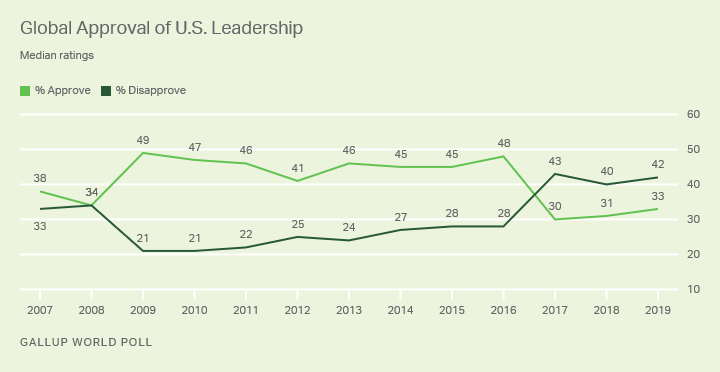 “After tumbling to a record-low 30% during the first year of Trump’s presidency, the image of U.S. leadership was not much better in the third year of his term. The median global approval rating for U.S. leadership across 135 countries and areas edged up to 33% in 2019. This rating is slightly higher than the previous low under Trump, but it is still one percentage point lower than the previous low of 34% under former President George W. Bush in 2008.”