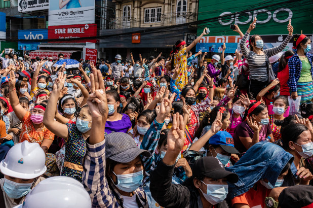 People make three-finger salutes of defiance during an anti-coup march in Yangon, Myanmar.