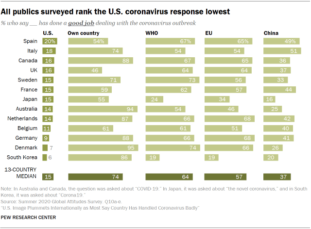 The image of the US declined precipitously among most countries during the Trump Administration and the decline was most obviously related to the poor management of the COVID pandemic. The Pew Research Center polled citizens in 13 nations and found that only “15% say the U.S. has done a good job of dealing with the outbreak. In contrast, most say the World Health Organization (WHO) and European Union have done a good job, and in nearly all nations people give their own country positive marks for dealing with the crisis (the U.S. and UK are notable exceptions). Relatively few think China has handled the pandemic well, although it still receives considerably better reviews than the U.S. response.”