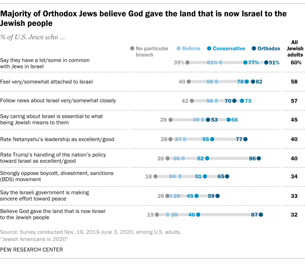 “Orthodox Jews were also more likely than Jews in other denominations to say that the Israeli government was making a sincere effort to reach a peace settlement with the Palestinians and that God gave the land that is now Israel to the Jewish people. By contrast, most Jewish Americans said they did not think that either the Israeli government or Palestinian leaders were sincerely seeking peace. And most Jewish adults took the position that God ‘did not literally give’ the land of Israel to the Jewish people (42%) or said they do not believe in God or a higher power at all (24%)…