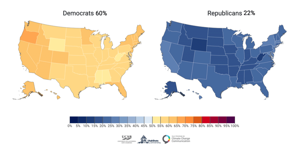 “The data show that Democrats and Republicans living in the same states or counties — or even sharing the same roof — can be a world apart when it comes to perceived experience with global warming (Fig. 1). While 60% of Democrats nationally say they have personally experienced global warming, only 22% of Republicans agree.”