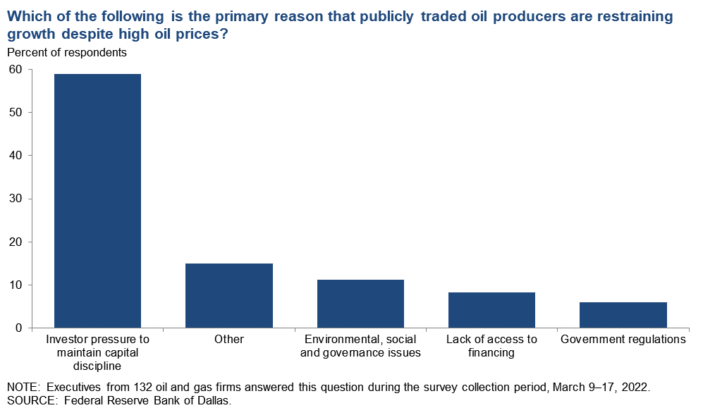 There have been a variety of explanations for the price increase. Some blame oil shortages caused by the sanctions against the sale of Russian oil. Others point to environmental regulations in the US, particularly with respect to building pipelines (the XL pipeline is often mentioned even though that oil was never meant for US domestic consumption). But the Dallas Fed did a survey of 132 executives from oil and gas producers in the US and came to a different conclusion, as indicated by the graph below: