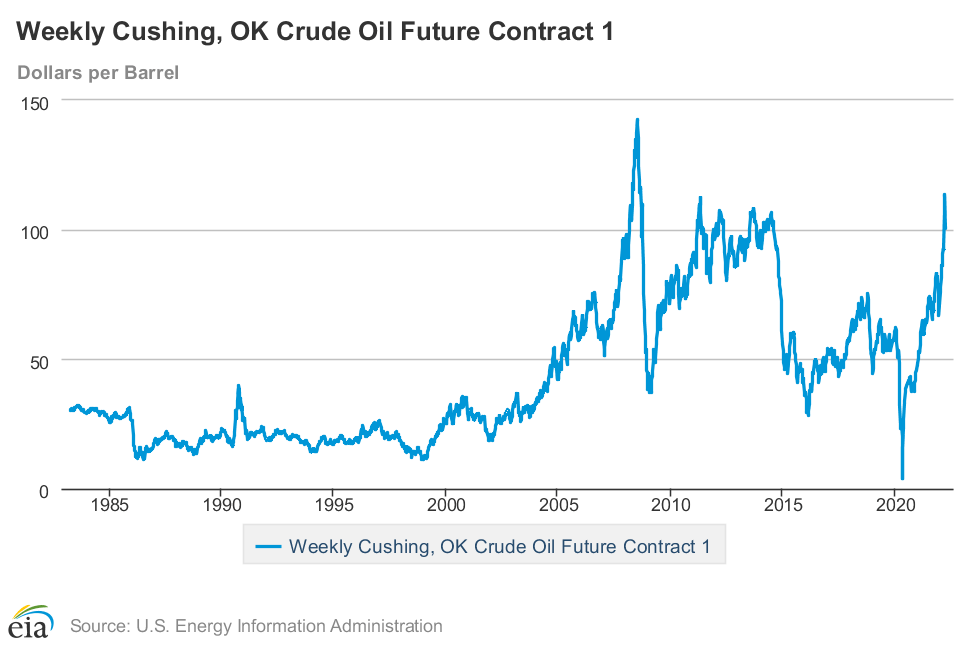 Gasoline prices in the US have increased dramatically over the last few months. The chart below reflects the price of crude oil stored in Cushing Oklahoma as recorded by the US Energy Information Administration.