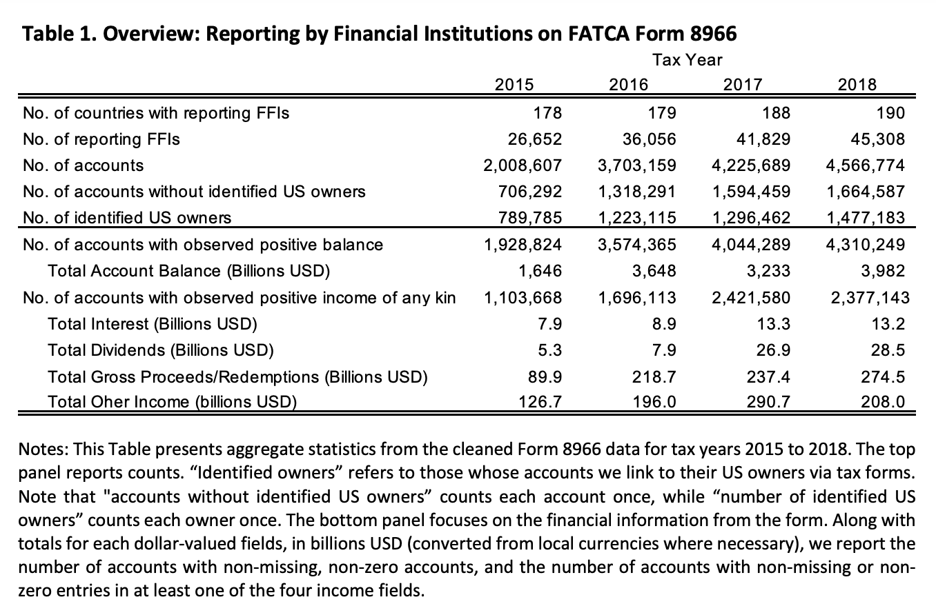 “According to our estimates, around 1.5 million U.S. taxpayers held foreign financial accounts with aggregate assets of around $4 trillion in tax year 2018. By comparison, the total financial assets of U.S. households totaled roughly $80 trillion according to official financial accounts (Federal Reserve, 2022). Around half of the assets in foreign accounts, just below $2 trillion, were held in jurisdictions usually considered tax havens, such as Switzerland, Luxembourg and the Cayman Islands. Just 14% of accounts are located in tax havens compared to nearly half the total wealth, which reflects that accounts in havens were on average larger.”