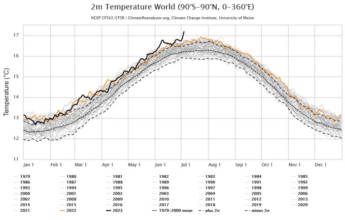 “Thursday’s planetary average surpassed the 62.9-degree mark (17.18-degree mark) set Tuesday and equaled Wednesday, according to data from the University of Maine’s Climate Reanalyzer, a tool that uses satellite data and computer simulations to measure the world’s condition. Until Monday, no day had passed the 17-degree Celsius mark (62.6 degrees Fahrenheit) in the tool’s 44 years of records.”