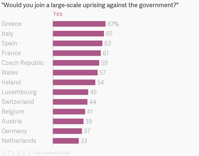The European Union recently conducted a poll: “Around 580,000 respondents in 35 countries were asked the question: Would you actively participate in large-scale uprising against the generation in power if it happened in the next days or months? More than half of 18- to 34-year-olds said yes.” What is very interesting about the poll is that it was taken in the context of a clear decline in voting by that same age cohort. It appears as if democracy no longer seems viable to many young people.