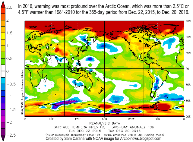 “Within the Arctic, the Arctic Ocean is warming most rapidly. While the Arctic as a whole was as much as 3.34°C or 6.01°F warmer than in 1979-2000 on December 22, 2016, temperatures over much of the Arctic Ocean were at the top end of the scale that day, i.e. as much as 30°C or 54°F warmer than in 1979-2000.”