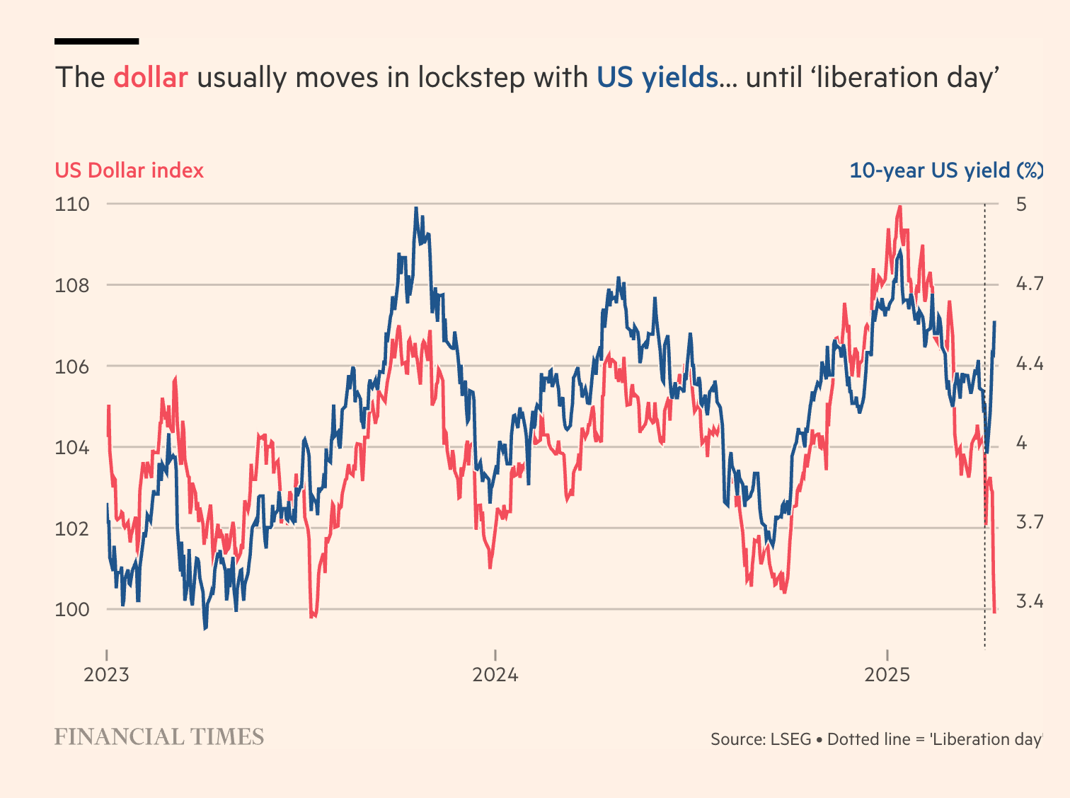 “If bond yields were rising because of stronger American economic growth, they would bring about a stronger greenback. That the dollar is falling instead suggests investors are worried about America’s economic stability. It is an ominous repeat of a pattern that struck in Britain after Liz Truss’s disastrous “mini-budget” in 2022, which promised unaffordable tax cuts. Although Mr Trump’s tariffs raise money for the government, such revenue could be dwarfed by the higher payouts required by rising bond yields.